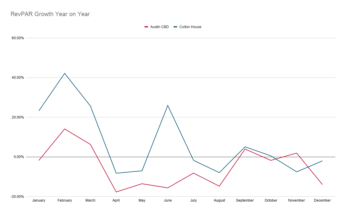Last year was not a great year for the market of Austin, Texas according to CoStar data. The rolling 12 month revPAR change was -6.10% year over year. Our client, the Colton House Hotel, however fared much better.