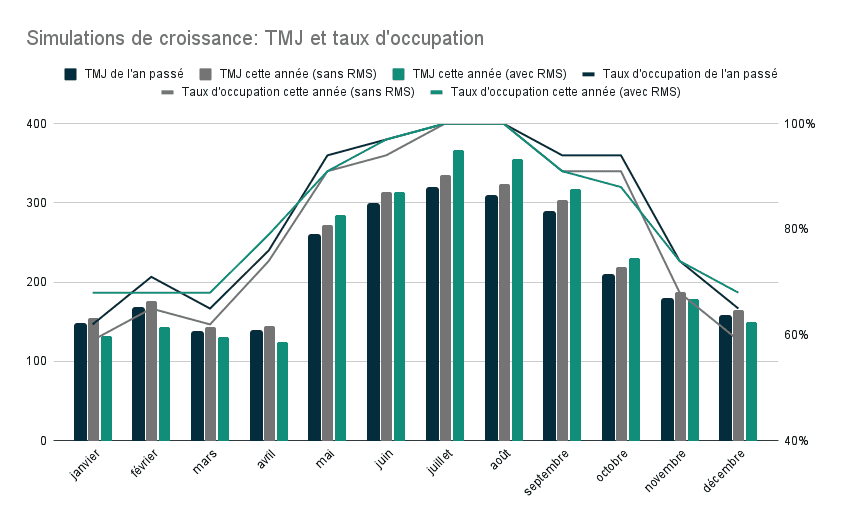En augmentant les tarifs de 5 % de façon systématique, vous risquez de perdre des parts de marché au profit de vos concurrents durant certaines périodes, sans nécessairement compenser cette perte par une hausse suffisante en haute saison. Cette baisse de l’occupation peut ultimement entraîner une diminution des revenus d’une année sur l’autre. Un RMS, quant à lui, analyse la dynamique actuelle du marché afin d’optimiser les tarifs pour chaque journée de l’année, demeurer compétitif et maximiser les revenus lorsque la demande est la plus élevée. C’est précisément dans cet équilibre délicat entre l’ADR et le taux d’occupation qu’un RMS vous aide à maximiser vos revenus.