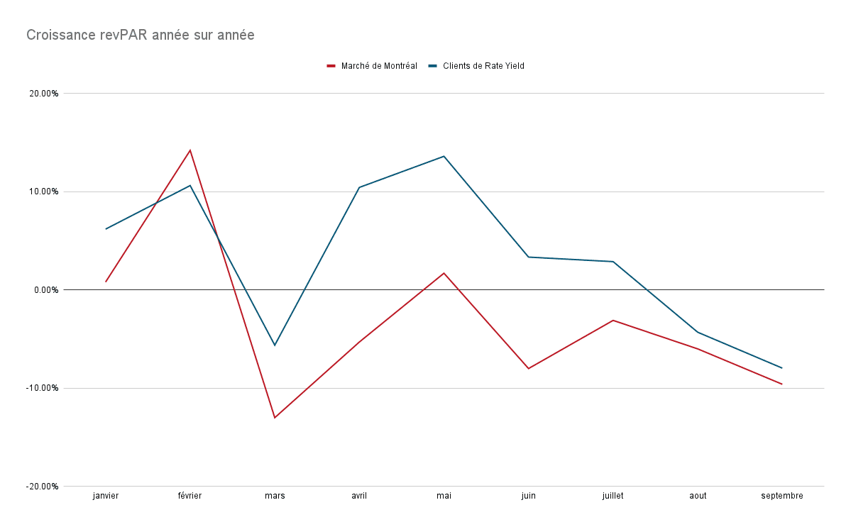 Nous sommes fiers de constater que nos clients montréalais ont surpassé le marché en croissance du RevPAR pour tous les mois, à l’exception d’un seul. En février, mois en question, la croissance de l’ADR chez les clients Rate Yield a atteint 7 %, contre 4,2 % pour le marché, illustrant une volonté affirmée de privilégier la rentabilité à travers la croissance de l’ADR plutôt qu’un simple gain d’occupation.